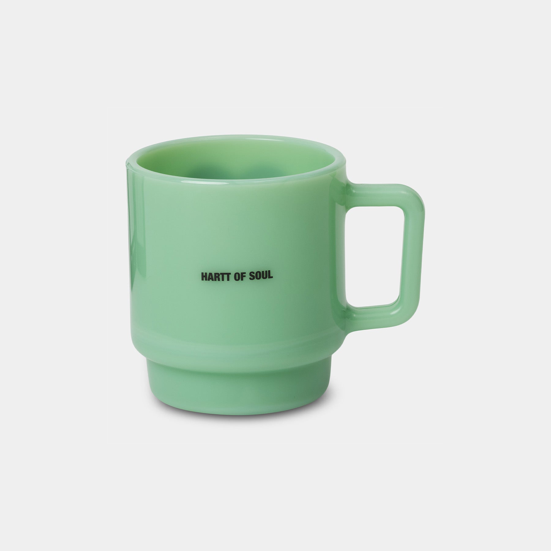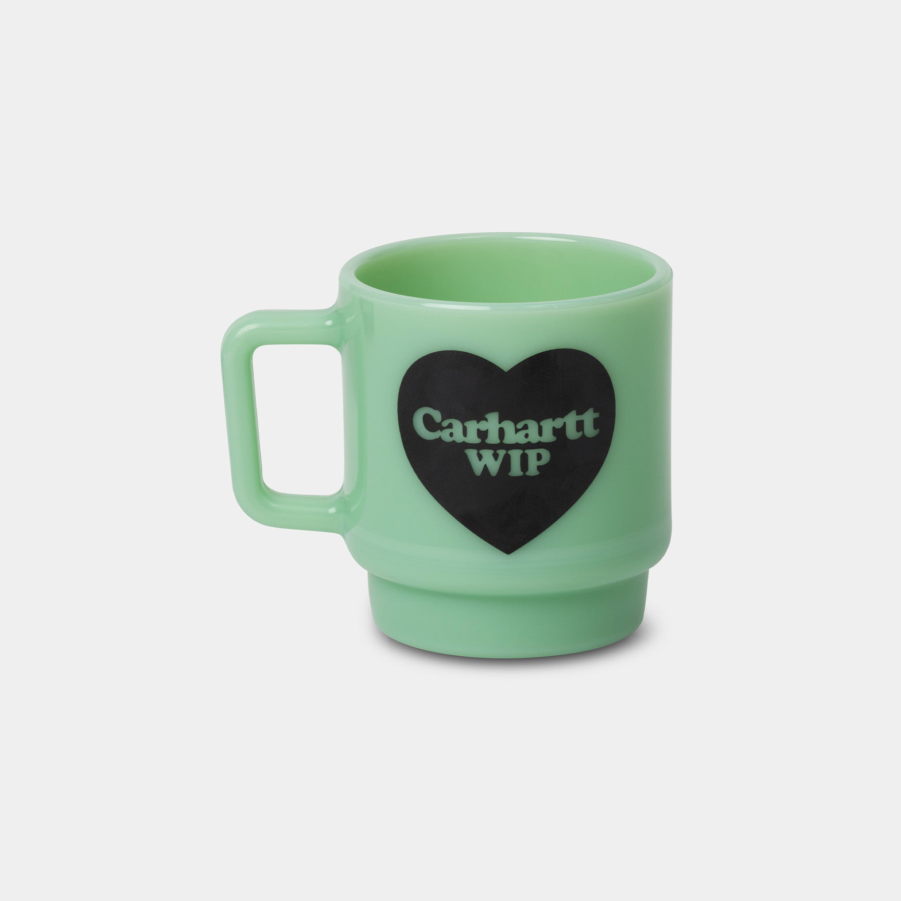 The Heart Glass Mug is a stackable design made from glass. Graphic prints appear on the sides.
