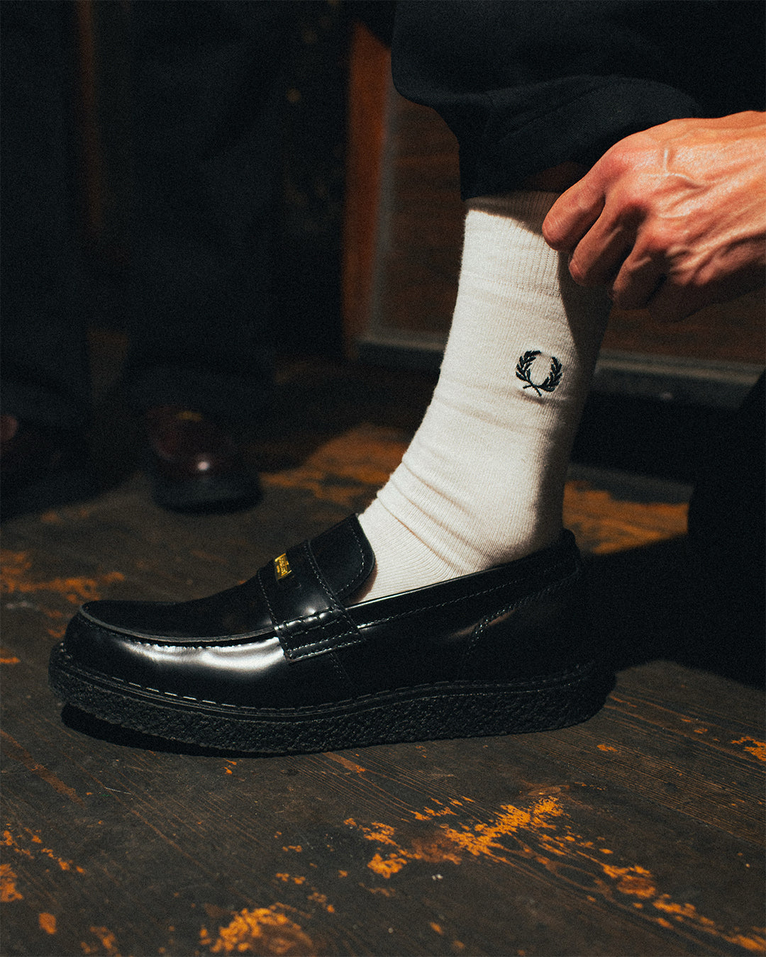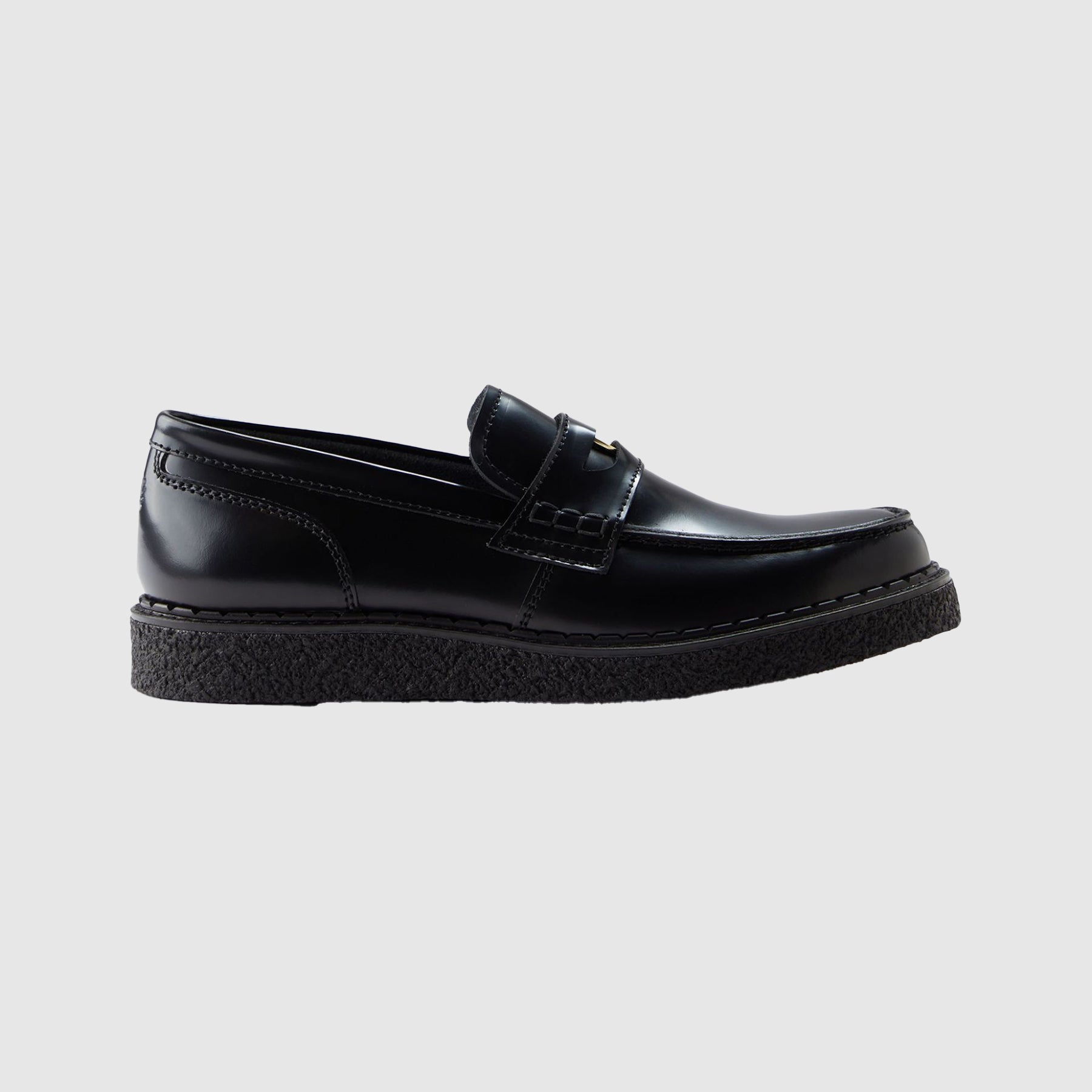 Corrected leather upper / Butted seam front / Dual-branded removable penny / Hand-sewn beef-roll penny saddle / Chunky crepe outsole