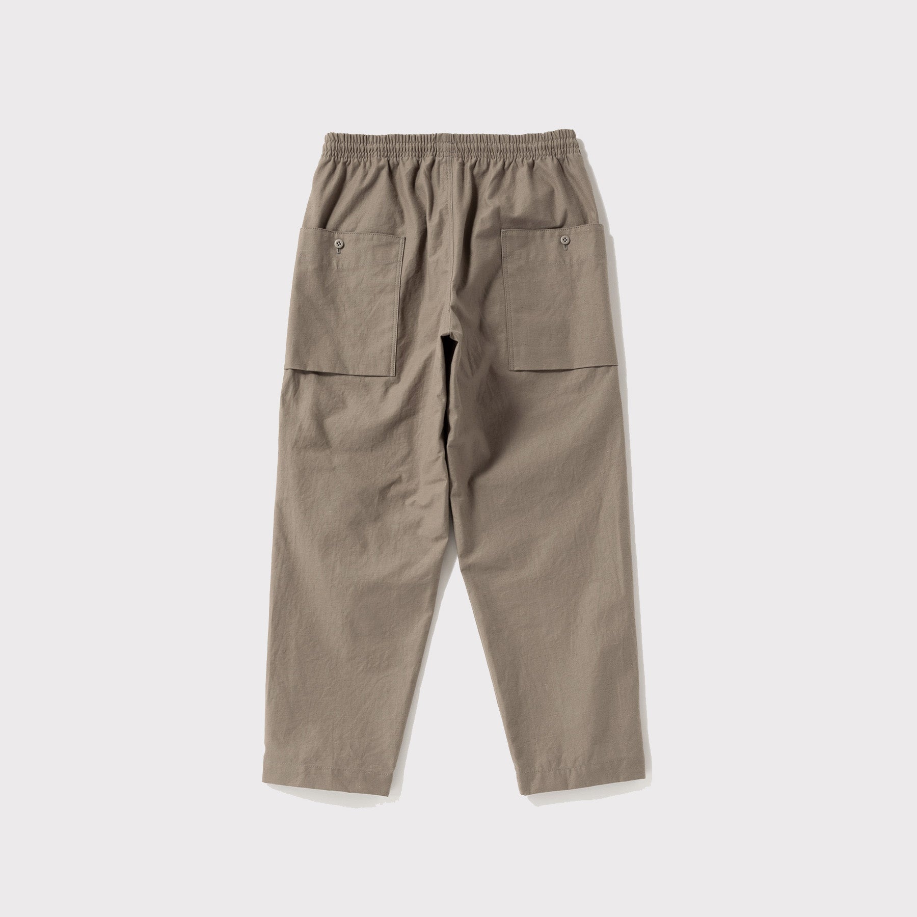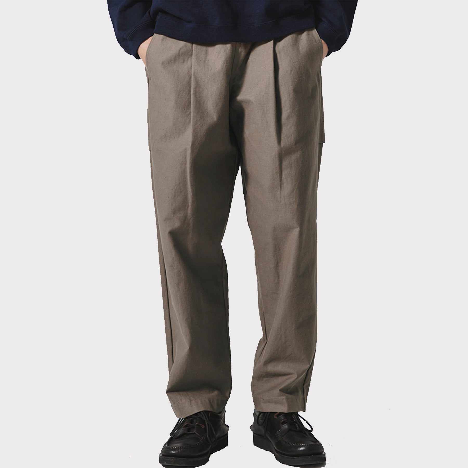 With the motif of umpire pants, a large pocket is placed from the waist to the hips. The new Umps Pants are made of a dry cotton blend from the USA and Australia, using yarns spun in a way that creates neps by adjusting the machine when carding the raw cotton (a process to remove impurities and align the fibers in a certain direction). This is a very technical process, and it is difficult to get the neps to be strong or weak. On the other hand, it has a natural and rustic look. Since nep yarn is a weak yarn that breaks more easily than usual, delicate control is necessary when weaving. Therefore, we use an old-fashioned "rapier loom," which is capable of weaving with strength on weak yarns such as silk.