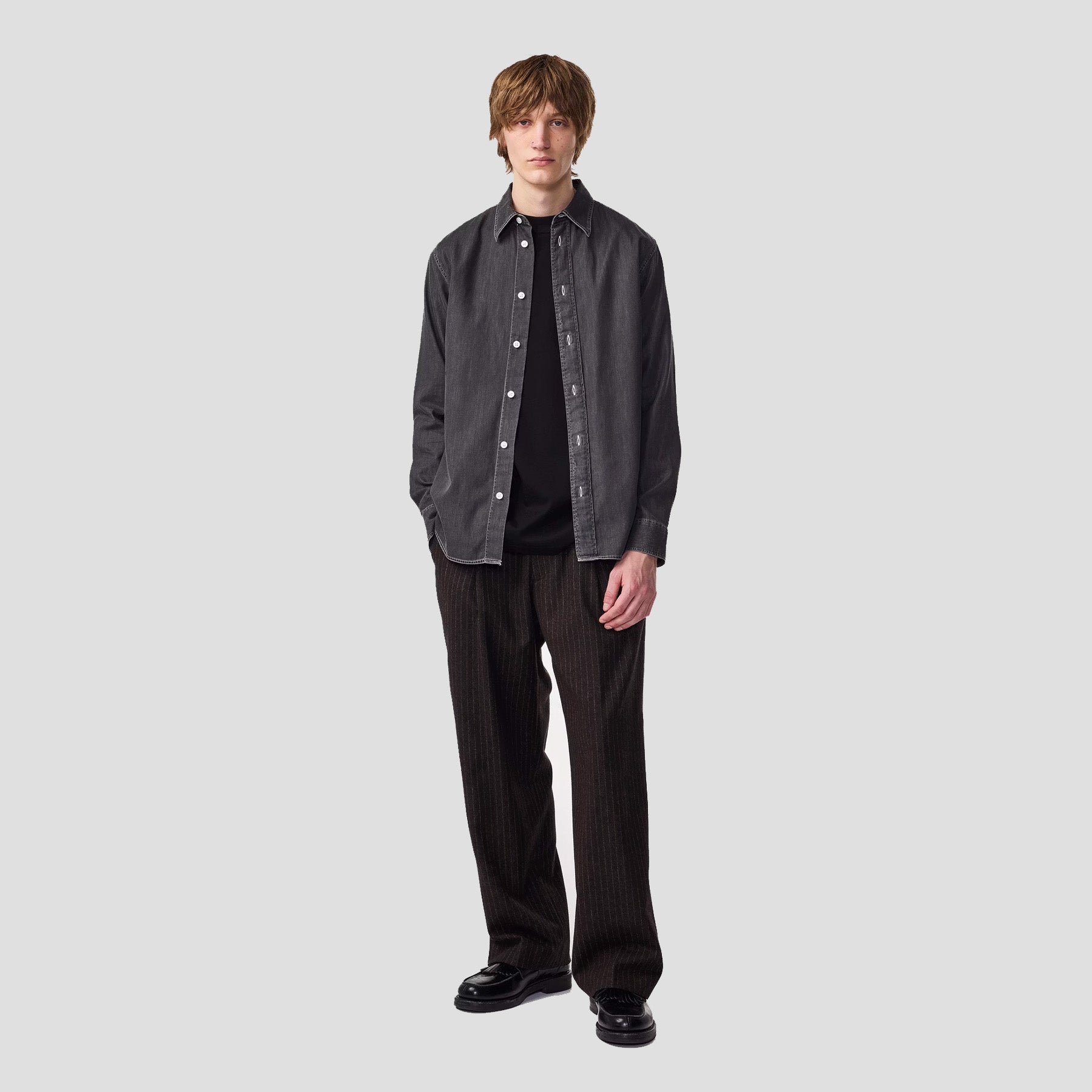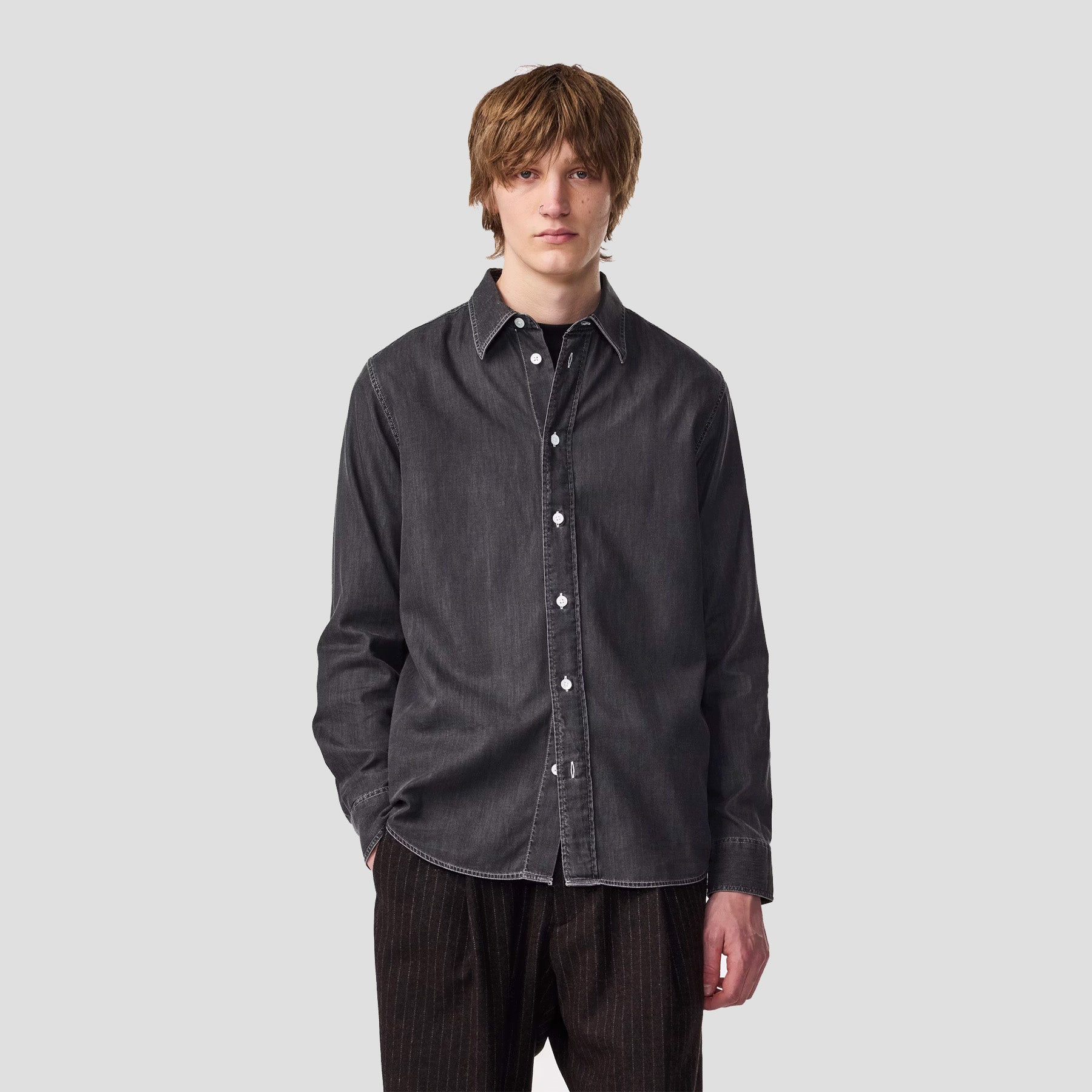 Casual denim shirt crafted from soft Egyptian organic cotton twill, featuring Mother-of-Pearl buttons, a wide placket, and a large collar.
