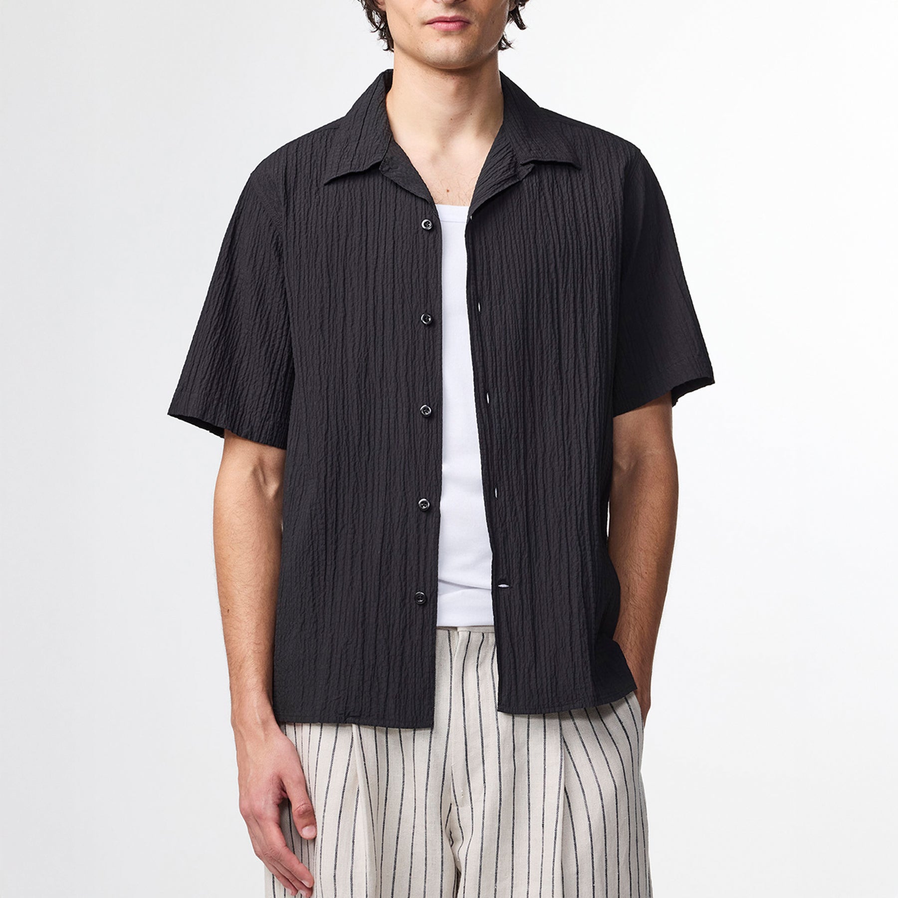 Open collar shirt crafted from premium European linen with a soft handfeel and crispy texture. Features dye-to-match NN.07 buttons and a clean silhouette for a refined summer look. Made in Turkey 100% Linen European