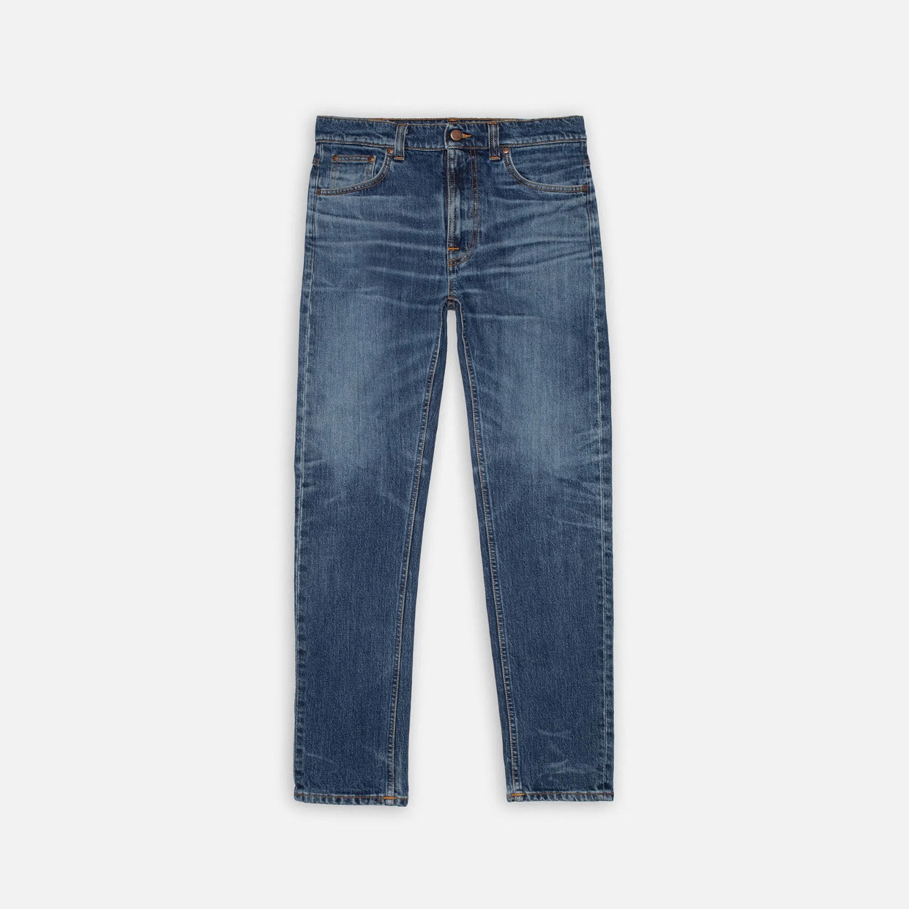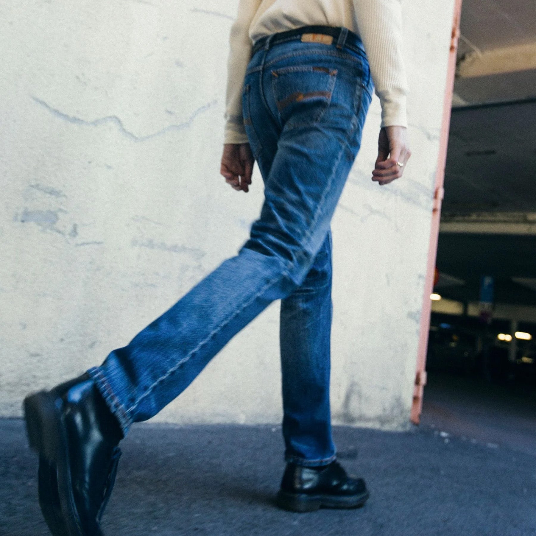 The Solid Ollie Life Tracks faithfully replicate the fades and wear marks of an original pair of worn-in Nudie Jeans. Using a precise method, every detail of the original has been captured and recreated on a new pair of jeans. Crafted from exceptional denim, these jeans are washed to a dark blue indigo tone with contrasting highlights. The fabric features a pronounced diagonal texture with a well-balanced slub, creating a salt-and-pepper pattern that accentuates the darker areas. The recreated fades and wear marks deliver an undeniably authentic worn-in aesthetic.